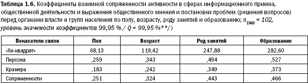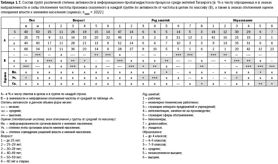 Во-первых, наиболее активны в выделенной подсистеме мужчины, лица возраста 30 – 39 лет, с образованием от среднего и выше, ИТР, административный аппарат предприятий и незанятая на производстве интеллигенция (через 10 лет она полностью оттеснит ИТР из зоны пропагандистской работы, но не от участия в руководстве предприятиями через общественные организации). Во-вторых, женщины и домохозяйки принадлежат к нижней страте активности разбираемой подсистемы. В-третьих, развитая сеть вузов, охватывая группу учащихся формами устной пропаганды, ведет к положительной оценке учащимися (лицами с незаконченным высшим образованием) совпадения решений органов власти и мнений населения, хотя в процессе выражения общественного мнения и постановки социальных проблем перед властными структурами, как показывает дополнительный анализ, эта группа практически не участвует. В-четвертых, положительные оценки той или иной формы аккумуляции информации органами власти от населения растут именно в тех социально-профессиональных и образовательных группах, которые наиболее интенсивно задействованы в формах информационно-политического процесса, и падают у незадействованных в нем. При этом выделяется группа пенсионеров. Пенсионеры представляют собой пассивную в целом группу в контуре обмена информацией между населением и органами власти. Но 5 % пенсионеров из активной группы (табл. 1.7) дают по 3 – 4 обращения в каналы выражения общественного мнения. Эти 5 % дают суммарную массу обращений в органы власти сопоставимую со всей массой обращений активной в этом деле администрации аппарата предприятий и учреждений и порождают в массовом сознании иллюзию активности пенсионеров. Часть группы не хочет покорно сходить с арены социальной жизни и частота событий, вызванных ее поведением (которое можно назвать последним всплеском), порождает ложные формы общественного мнения. При этом вся группа пенсионеров ставит «неуд» органам власти в их работе по приему информации от населения.