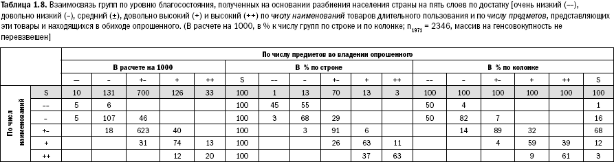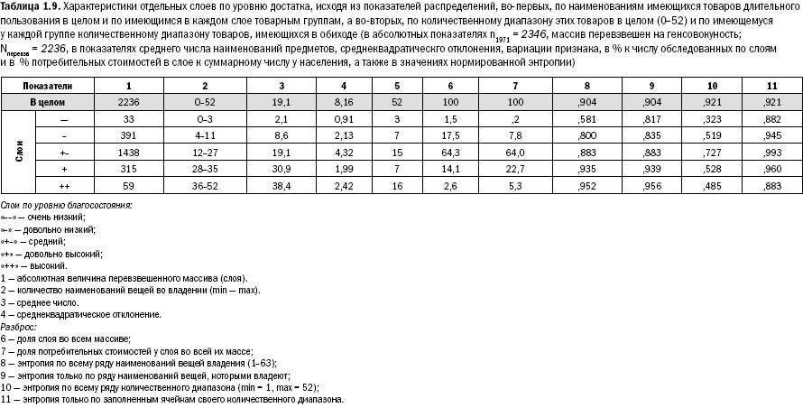 Этот показатель дифференцирует население по количеству потребительных стоимостей, находящихся в семейном или личном распоряжении человека. Распределение относительно среднего числа товаров длительного пользования, имеющихся в обиходе у населения, оказалось также близким к нормальному и достаточно стабильным до определенного периода. Кроме того, количественно-качественная структура владения товарами длительного пользования также оказалась четко промаркирована социально[25].