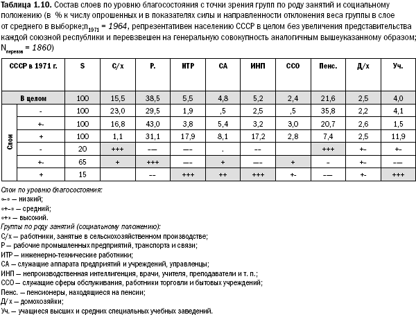 Показатели энтропии в слоях по уровню благосостояния очень похоже варьируются на аналогичные показатели активности в информационной и общественно-политической подсистеме. Это значит, что существует социально предопределенный «стандарт» количественно-качественных сочетаний в предметном мире людей, вызванный попаданием их в определенный ареал пространственно-временной фигуры социальной системы. Дифференциация по богатству существует даже в обществе с ненасыщенным товарами рынком и низкой степенью товарного покрытия денежной массы у населения. Пятая часть населения (19 %) имеет в обиходе лишь 8 % вещного мира бытовой среды, в то время как 17 % населения (меньшая часть) присваивает себе 28 % этой «вселенной». Второй важный вывод следует из табл. 1.10, где видно долю в этих слоях групп по роду занятий и социальному положению[26].