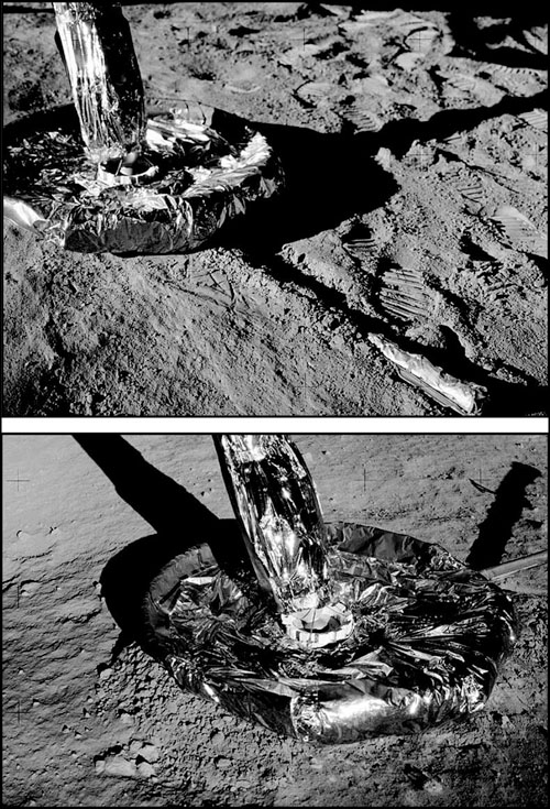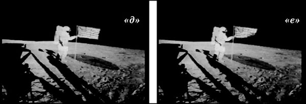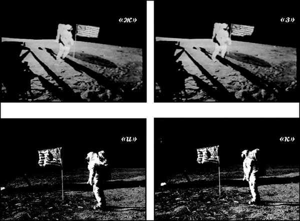 А на фото «и» и «к» показаны результаты съемки кинокамерой. Сравнение кадров видео– и кинокамеры показывает, что на видеокамерах древко флага ниже, чем на кинокадрах; на видеокадрах полотнище флага без складок и разглаженное, а на кинокадрах оно имеет большую вертикальную складку; и, наконец, на видеокадрах полотнище флага расположено поперек тени от «лунной кабины», а на кинокадрах – вдоль.