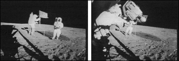 Дело в том, что на фотографиях и видеокадрах эпизода об «Аполло-11» присутствуют два американских флага, хотя, по легенде, был установлен только один. Давайте рассмотрим фотографии рисунка № 12. Первые восемь фотографий – это кадры видеосъемки, которая производилась видеокамерой, установленной где-то на «лунной кабине», и передавалась на Землю как прямой репортаж «с Луны».