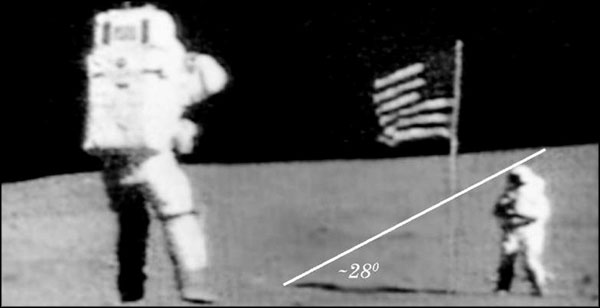 На фото видно, что солнце светит справа почти перпендикулярно оси съемки, поскольку оба астронавта освещены наполовину, т. е. искажение длины тени очень небольшое. От артиста, играющего астронавта Дюка, падает четкая тень, причем ее длина всего в 1,8 раза больше высоты астронавтов, а такую тень могло дать солнце, стоящее над горизонтом не ниже чем в 29°. Надо думать, что экипаж «Аполлона-16», как и экипаж «Аполлона-11», вышел на поверхность Луны не позже 9 часов после прилунения и в свой первый выход он находился вне кабины около 7 часов, т. е. этот снимок был сделан максимум через 16 часов после посадки. За это время от 5° солнце поднялось в лучшем случае до 14°. Но при 14° тени от предметов должны быть в 3,8 раза длиннее их высоты, а не в 1,8. Если бы эта съемка была с Луны, то тень от Дюка вышла бы за левую границу кадра, т. е. «прямой репортаж с Луны» в предпоследней экспедиции «Аполлон-16» также снимался в Голливуде, поскольку «Дюк» освещается не солнцем, а павильонным прожектором.