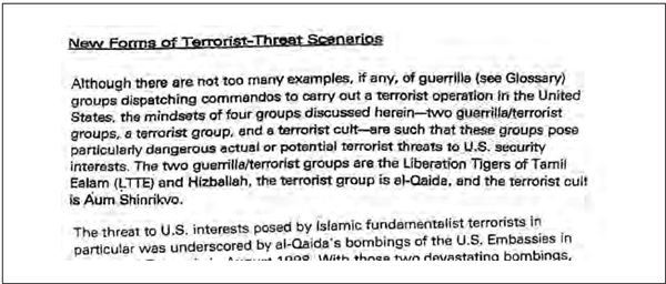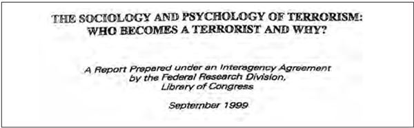 Это исследование на 178 страницах, озаглавленное «Социология и психология терроризма: кто становится террористом и почему?», было осуществлено Федеральным исследовательским отделом Библиотеки Конгресса в сентябре 1999 года. Оно привлекло внимание к тому, что реакция Аль-Каиды на ракетные атаки своих лагерей, предпринятые американцами в августе 1998 года, может принять множество разных форм. Среди предполагаемых сценариев рассматривается следующий: