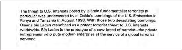 Угрозы для США, исходящие от террористов, исповедующих исламский фундаментализм, особенно подчеркиваются терактами с использованием бомб, совершенными АльКаидой против американских посольств в Кении и Танзании в августе 1998 года. Организовав эти два опустошительных взрыва, Усама бен Ладен заявил о себе как о мощной террористической угрозе американским объектам во всем мире. Бен Ладен – э то прообраз нового типа террориста: частный предприниматель, направляющий доходы от своего современного предприятия на поддержку сетей всемирного терроризма.