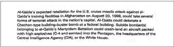 Месть Аль-Каиды за удары американскими крылатыми ракетами, разрушившими несколько их тренировочных лагерей в Афганистане 20 августа 1998 года, может принять разные формы террористических атак в столице США. Аль-Каида может взорвать самодельную бомбу «чеченского» типа, способную разрушить каменное строение, возле одной из штаб-квартир федеральных ведомств. Кроме того, смертники из «батальона мучеников» Аль-Каиды могут обрушить самолеты, начиненные сверхмощной взрывчаткой (С?4 или «Семтекс»), на Пентагон, на штаб-квартиру ЦРУ или на Белый дом.
