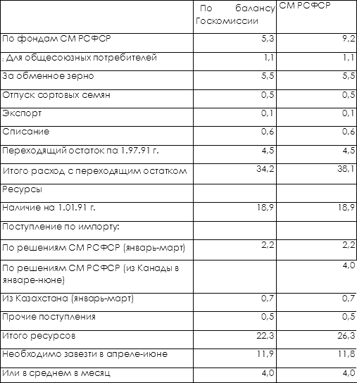 При неустойчивом положении с зерном волевые решения руководства центральных, республиканских органов, корректирующих запланированные объемы поставок хлебопродуктов, произвольно изменяющих адреса получателей начинают приобретать массовый характер. Это еще более дестабилизирует обстановку. При недостатке ресурсов пшеницы для производства муки под давлением местных органов она используется на выработку комбикормов. Автор цитированного письма продолжает: «В апреле обстановка обострится еще больше и при непринятии экстренных мер по ускорению завоза зерна из Казахстана и по импорту (к данным 2,6 млн. тонн дополнительно не менее 1 млн. тонн) неизбежно приведет к массовым срывам в снабжении населения хлебопродуктами, а общественного животноводства концкормами. По имеющейся информации завоз импортного зерна в мае из центра централизированных источников ожидается значительно ниже уровня апреля т. г. и не обеспечит снабжение населения продовольствием. Министерство хлебопродуктов РСФСР, начиная с четвертого квартала 1990 г., неоднократно докладывало руководству страны и республики о складывающемся критическом положении с государственными ресурсами зерна. Однако исчерпывающих мер принято не было.