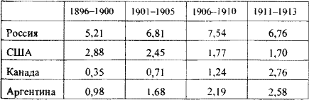 Модель догоняющей индустриализации создавала политические риски. Их опасность в полной мере проявилась в России в начале XX в. Однако и в это время политика царского правительства не вела к аграрному кризису, при котором промышленное производство растет на фоне сокращения сельскохозяйственного. Средняя по десятилетиям урожайность зерна устойчиво росла. Россия оставалась его крупнейшим экспортером (см. табл. 4.4. 4.5).
