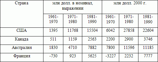Сальдо торговли продовольствием в США, Канаде, Австралии и Франции, в среднем за год, в 1961–1990 гг.