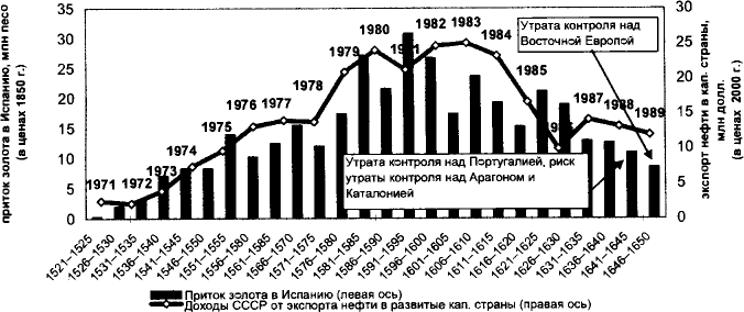 Источник: Flynn D. O. Fiscal crisis and the decline of Spain (Castile) // The Journal of Economic History. 1982. Vol. 42. P. 142; Внешняя торговля СССР. Статистический сборник за годы: 1971, 1973, 1975, 1977, 1979, 1981, 1983, 1985, 1987, 1989. М.: Финансы и статистика; International Financial Statistics 2005, IMF.