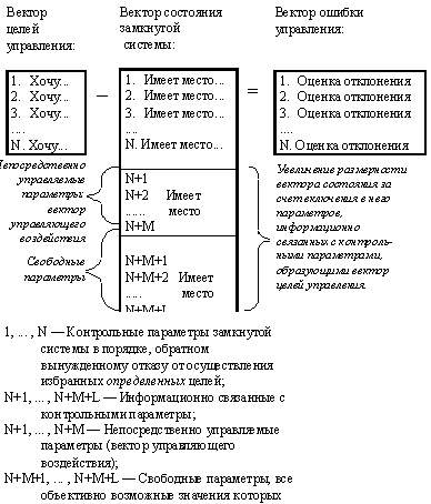 Возможно, что после прочтения этой главы у читателя возникло некоторое непонимание. К.Прутков сказал: “Многие вещи нам непонятны не потому, что наши понятия слабы; но потому, что сии вещи не входят в круг наших понятий.” То есть дело в отсутствии необходимых стереотипов распознавания явлений и формирования их образов. Поэтому надо взять ручку и бумагу и перечитать раздел вторично, рисуя для себя схемы и образы категорий и состояний объектов, замкнутых систем, их иерархий и суперсистем в процессах их взаимодействия. Если сказано, что вектор целей — список, то надо расписать для себя некий список; если сказано, что вектор состояния повторят по содержанию вектор целей и сверх того включает в себя информационно связанные параметры, то рядом с вектором целей следует изобразить вектор состояния; продолжая такое изображение, сопровождающее наше изложение информации, можно получить рисунок, подобный приведенному рис. 1.