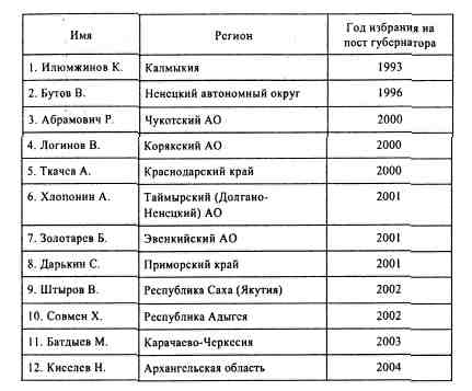 Тот же процесс нарастания прямого влияния бизнеса на региональную политику заметен и при формировании органов исполнительной власти. С каждым годом увеличивалось число губернаторов-бизнесменов. «Первой ласточкой» была Калмыкия, где известный предприниматель К. Илюмжинов был избран президентом еще в 1993 г. В 1996 г. губернаторские кресла заняли еще три местных олигарха — в Мурманске Ю. Евдокимов (представляющий интересы московской АФК «Система» в регионе), в Калининграде — Л. Горбенко, и в Ненецком АО — В. Бутов. Волна выборов 2000–2001 гг. дала новое прибавление — губернаторами своих территорий становятся главы крупнейших промышленных структур: на Чукотке — Р. Абрамович, глава нефтяной компании «Сибнефти» (2000 г.); на Таймыре — А. Хлопонин, глава «Норильского никеля» (2001 г.); в Эвенкии — Б. Золотарсв, один из руководителей нефтяной компании ЮКОС (2001 г.). В Краснодарском крае, Корякском автономном округе и Приморском крае побеждают местные олигархи — А. Ткачев, В. Логинов и С. Дарькин (декабрь 2000 г.). Позже к этому списку добавились Х. Совмен в Адыгее, В. Штыров в Республике Саха, М. Батдыев в Карачаево-Черкесии, Н. Киселев в Архангельске.