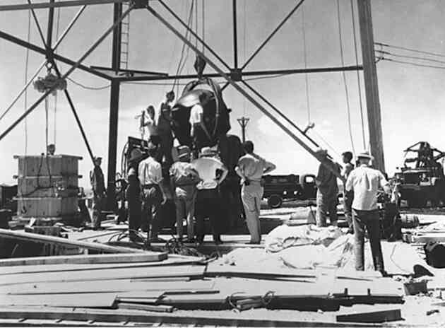 Подготовка к испытанию первого американского ядерного устройства плутониевой бомбы имплозивного типа. Июль 1945 года
