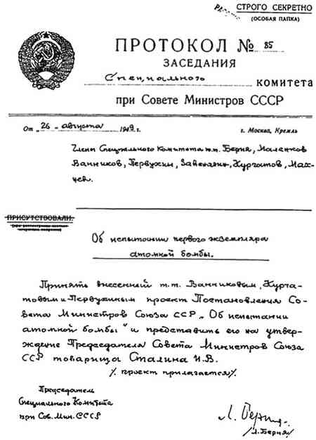 О том, что в Англии и в США ведутся атомные работы, Сталин и Берия знали с осени 1941 года. 28 сентября 1942 года было принято распоряжение ГКО № 2352сс «Об организации работ по урану». 11 февраля 1943 года распоряжением ГКО № ГОКО-2872сс повседневное руководство работами по «урановой бомбе или урановому топливу» было возложено на зампреда СНК СССР и наркома химической промышленности СССР М.Г. Первухина и председателя Комитета по делам высшей школы при СНК СССР, уполномоченного ГКО по науке С.В. Кафтанова. Исследованиями занималась «спецлаборатория атомного ядра Академии наук СССР» (Лаборатория № 2) профессора И.В. Курчатова.