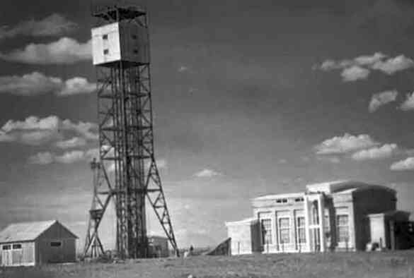 Башня на которой был размещен заряд первой отечественной атомной бомбы РДС-1. Рядом — монтажный корпус. Полигон под Семипалатинском, 1949 год