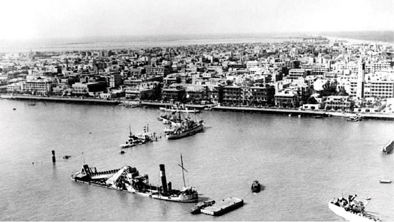 Затопленные египетские корабли перекрывают Суэцкий канал, 1956 г.