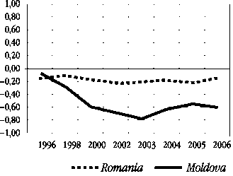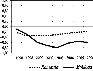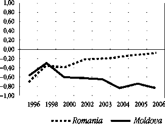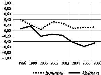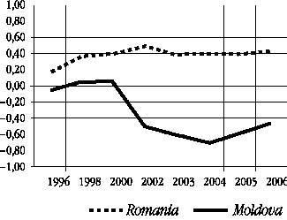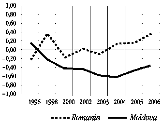 Показатель Молдова Румыния Источник Люди и общество Место в мире по индексу человеческого развития 114(средний) 60(высокий) HDR2006, данные 2004 Индекс человеческого развития 0.694 0.805 HDR2006, данные 2004 Ожидаемая продолжительность жизни (лет) 68.1 71.5 HDR2006, данные 2004 Младенческая смертность (на 1,000 рожденных живыми) 23 17 HDR2006, данные 2004 Детская смертность до 5 лет (на 1,000 рожденных живыми) 28 20 HDR2006, данные 2004 Грамотность взрослого населения (%) 98.4 97.3 HDR2006, данные 2004 Охват тремя ступенями образования (%) 70 75 HDR2006, данные 2004 Пользователи мобильной связи (на 1,000 человек) 187 471 HDR2006, данные 2003 Пользователей интернет (на 1,000 человек) 103 208 WDI2006 — MD, RO Экономика ВВП на душу населения (в долларах, ППС) 1,729 8,480 HDR2006, данные 2003 Чистый приток прямых иностранных инвестиций, % ВВП 6.6 6.7 WDI2006 — MD, RO Время необходимое чтобы начать бизнес (дней) 30 11 WDI2006 — MD, RO Индекс экономической свободы (место в мире) 59.5(81) 61.3 (67) Heritage Index of Economic Freedom 2007 Индекс свободы предпринимательства 70.0 70.9 Heritage Index of Economic Freedom 2007 Государство Голос граждан и подотчетность правительства (перцентиль) — 0.48 (32.7) +0.43(61.5) Worldwide Governance Indicators 2006 Политическая стабильность (перцентиль) — 0.48 (29.8) +0.12(50.0) Worldwide Governance Indicators 2006 Эффективность правительства (перцентиль) — 0.85 (22.3 — 0.05 (53.6) Worldwide Governance Indicators 2006 Качество регуляторных механизмов (перцентиль) — 0.36 (41.5) +0.37(62.0) Worldwide Governance Indicators 2006 Власть закона (перцентиль) — 0.61 (32.4) — 0.16 (50.5) Worldwide Governance Indicators 2006 Контроль над коррупцией (перцентиль) — 0.65 (30.1) — 0.18 (53.4) Worldwide Governance Indicators 2006 Индекс восприятия корупции (место в мире) 2.8(111) 3.7(69) TransparencyInti Индекс свободы экономики от Правительства 71.7 74.9 Heritage Index of Economic Freedom 2007Вопрос качества государственного управления заслуживает отдельного рассмотрения. Мировой банк регулярно собирает и публикует данные о качестве государственного управления Worldwide Governance Indicators (кстати, именно эти показатели ООН заложила в основу мониторинга своей пятилетней программы помощи Правительству). На основании разнообразных первичных данных рассчитываются шесть основных индикаторов «Голос граждан и подотчетность правительства», «Политическая стабильность», «Эффективность правительства», «Качество регуляторных механизмов», «Власть закона», и «Контроль над коррупцией». Для каждого индикатора считается индекс (от -2,5 «совсем плохо» до +2,5 «совсем хорошо») и перцентиль, показывающая выше какого процента стран находится данная страна (0 — последние в списке, 100 — первые в списке). Так вот — стартовав с примерно равных позиций в 1996 году, Молдова и Румыния пошли крайне разными путями. Если в Румынии индикаторы либо улучшались, либо оставались стабильными, то в Молдове они стабильно ухудшались. И обвинять в этом можно только себя, это вам не ВВП, который для маленькой открытой экономики сильно зависит от внешней конъюнктуры. Это — внутренняя эффективность власти, которая от власти и зависит.