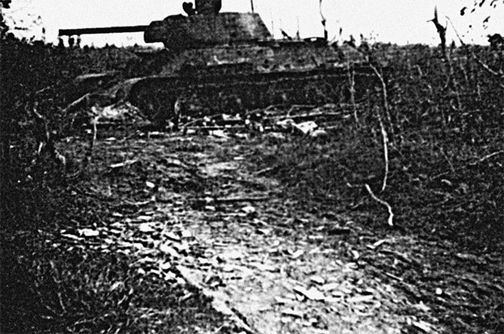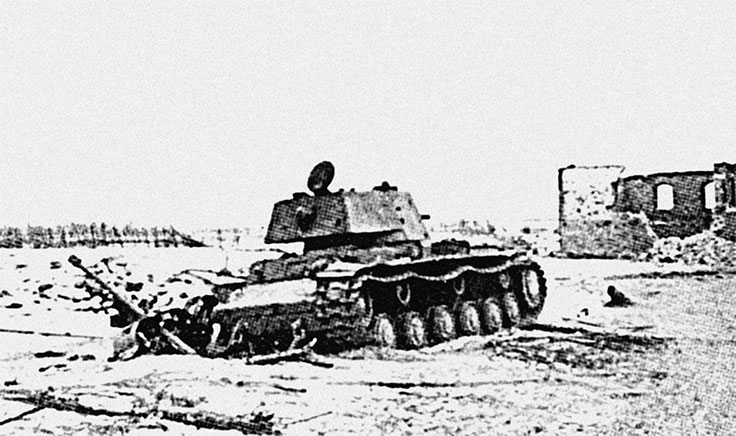 До дистанции 5 метров стреляло 37-мм противотанковое орудие, пока оно не попало под гусеницы танка близ д. Белый Бор